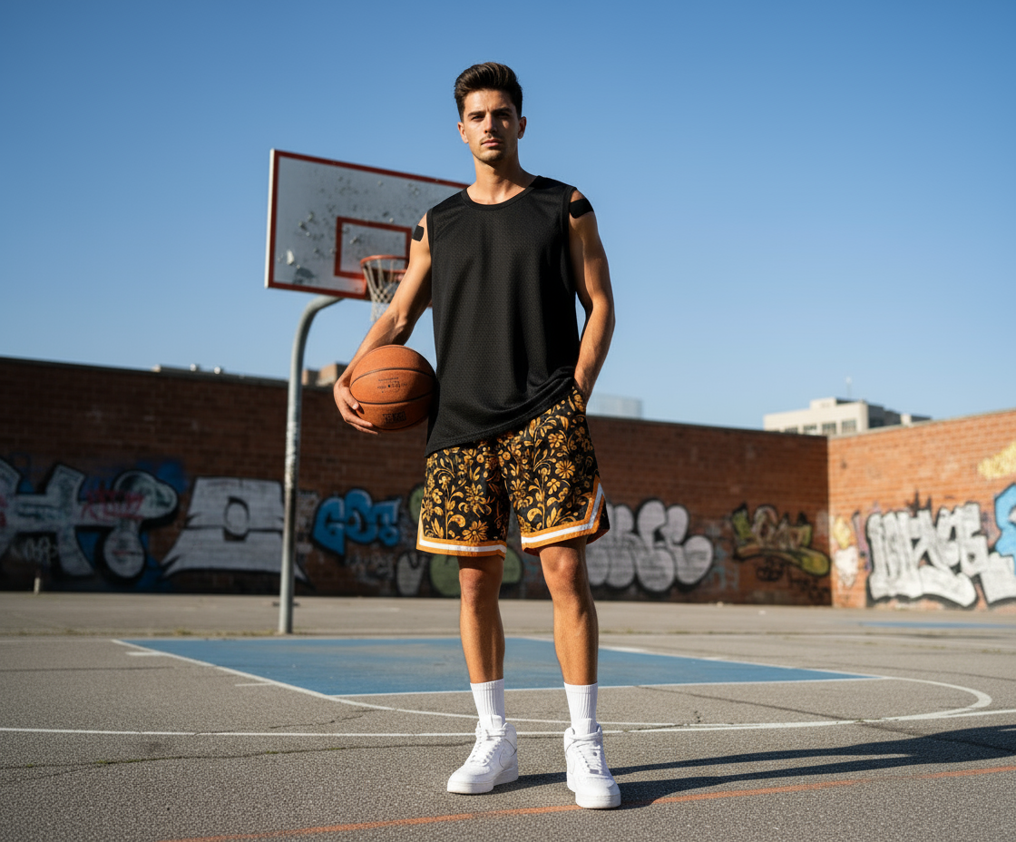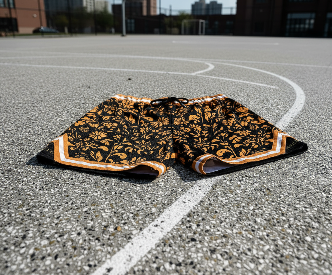 Inspired by the opulence of Italian baroque design, the Fiore Barocco shorts combine timeless elegance with modern performance. A deep black canvas is adorned with intricate golden florals, creating a bold yet refined aesthetic. Crafted for comfort and versatility, these shorts bring luxury to leisure — whether by the coast, in the city, or wherever your style takes you.